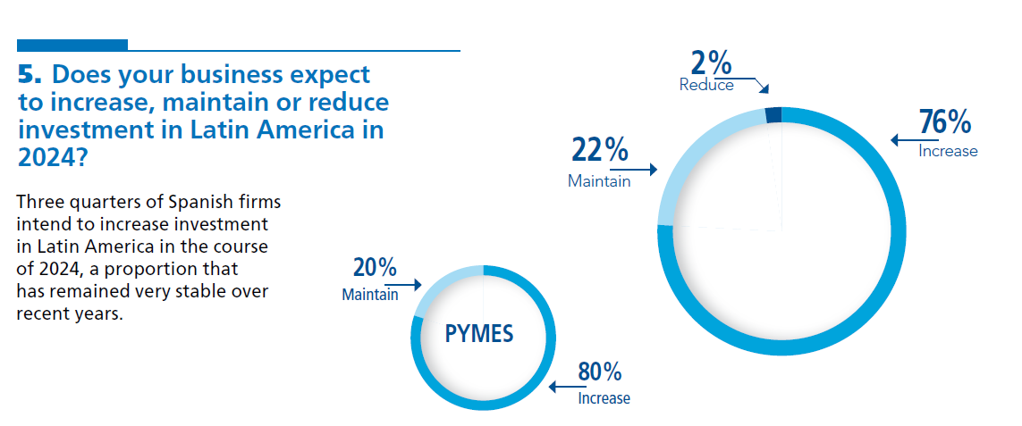 - 76% of the Spanish companies surveyed intend to increase their investments in Ibero-America in 2024. This figure is similar to last year’s, indicating a strong commitment to LATAM.