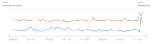 Crawling. Amount of queries and response time, according to Google Search Console. On the right side of the graph, the effect of the Xalok launch. The total values of the scale (requests and milliseconds) have been deliberately removed.